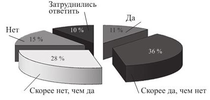 Ответы респондентов распределись практически поровну: 47 % (11 % + 36 %) в разной степени, но в целом положительно оценили условия проживания в городской среде, 43 % (15 % + 28 %) – дали отрицательный ответ, остальные (10 %) затруднились ответить.