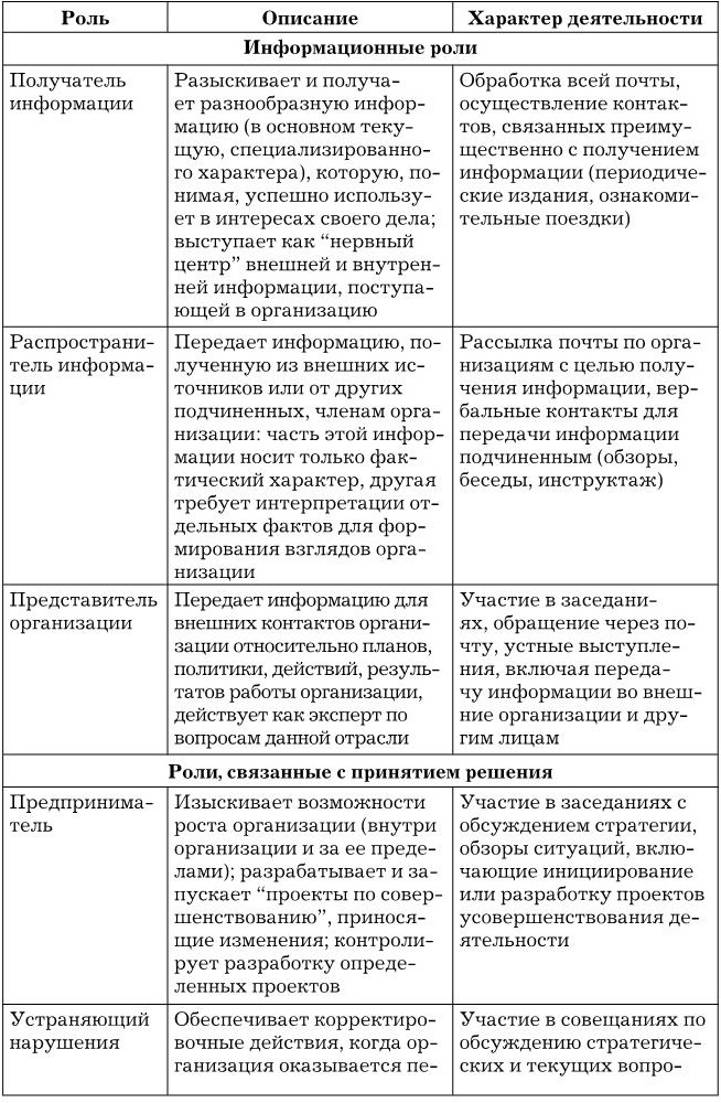 Более подробно роли менеджера в процессе управления описаны в табл. 1.2.