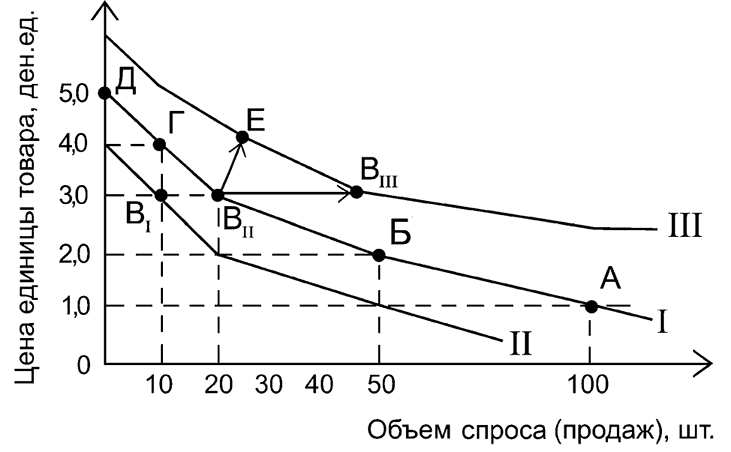 Передвижение спроса по кривой ценового спроса (кривая I) с изменением цены (при прочих равных условиях) называется изменением величины (объема) спроса. Наряду с данным понятием существует понятие «изменение спроса», которое отражает сдвиг кривой ценового спроса влево или вправо (кривые II, III) в зависимости от неценовых факторов товаров Б, В, Г, Д, Е.
