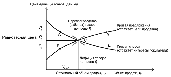 Когда планы продавцов и покупателей совпадают, рынок находится в равновесии – две кривые (спроса и предложения) пересекаются. Точка пересечения (С) позволяет определить равновесную цену (P2) и оптимальный объем продаж (Vp.оп). В точке равновесия нет ни дефицита (избыточного спроса), ни избыточного предложения, а значит, нет давления на цену. При избыточном спросе продавцы могут ее увеличить, понимая, что в данной ситуации покупатели заплатят больше. Рост цен, в свою очередь, вызовет увеличение предложения и «ущемит» спрос. В результате покупатели будут вынуждены «урезать» свое потребление, и в целом произойдет движение товара с точек А, В, Д, Е к точке равновесия. При избытке величины предложения товара по данной цене происходит превышение его объема над спросом, растут товарные запасы товаропроизводителей. Поэтому товаропроизводители сократят выпуск товара или снизят цены, или постепенно сделают то и другое. В итоге величина предложения упадет, а величина спроса возрастет. Рынок возвратится в состояние равновесия.
