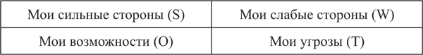 Техника SWOT (аббревиатура составлена из первых букв английских слов: сила, слабость, возможности и угрозы) предполагает выявление сильных и слабых сторон, угроз и возможностей, а также установление цепочек связей между ними, которые в дальнейшем могут быть использованы для формулирования стратегии и оценки реалистичности запланированных результатов деятельности руководителя.