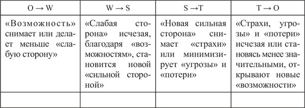При работе с техникой SWOT следует помнить, что возможности и угрозы могут переходить в свою противоположность. Так, неиспользованная возможность может стать угрозой. Или наоборот, удачно предотвращенная угроза может создать дополнительные сильные стороны и открыть новые возможности (табл. 1.1).