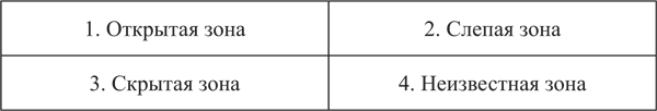 Зона 4 (неизвестное «Я») – это то, что неизвестно о личности ни самому человеку, ни окружающим. Именно за счет сокращения площади этого квадрата при желании можно повысить эффективность коммуникаций.