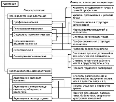 В условиях функционирования рынка труда возрастает роль вторичной адаптации. При этом необходимо внимательно изучать опыт зарубежных фирм, которые уделяют повышенное внимание первичной адаптации молодых работников. Данная категория персонала нуждается в особой заботе со стороны администрации организаций. Чаще всего профессиональная адаптация рассматривается как процесс приобщения человека к труду в рамках определенной профессии, включения его в производственную деятельность, усвоения им условий и достижения нормативов эффективности труда. Однако адаптацию нельзя рассматривать только как овладение специальностью. Она предусматривает также приспособление новичка к социальным нормам поведения, действующим в коллективе, установление таких отношений сотрудничества работника и коллектива, которые в наибольшей мере обеспечивают эффективный труд, удовлетворение материально-бытовых и духовных потребностей обеих сторон. Виды адаптации и факторы, на нее влияющие, приведены на рисунке.