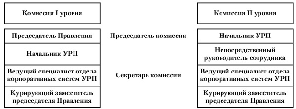 Необходимо определить состав оценочной комиссии. Состав будет различаться в зависимости от уровня оцениваемых сотрудников. Формируется оценочная комиссия I уровня для оценки «Руководителей II уровня». Оценочная комиссия II уровня создается для оценки «Руководителей III уровня» и «специалистов» (рис. 3).