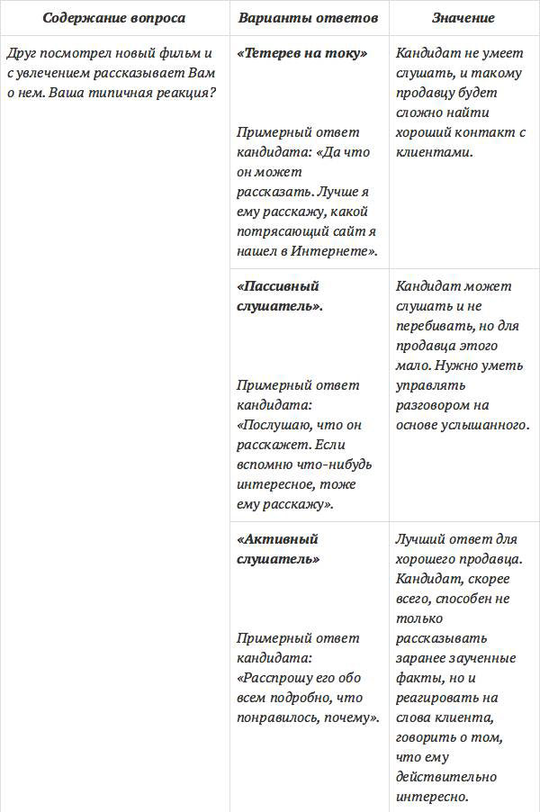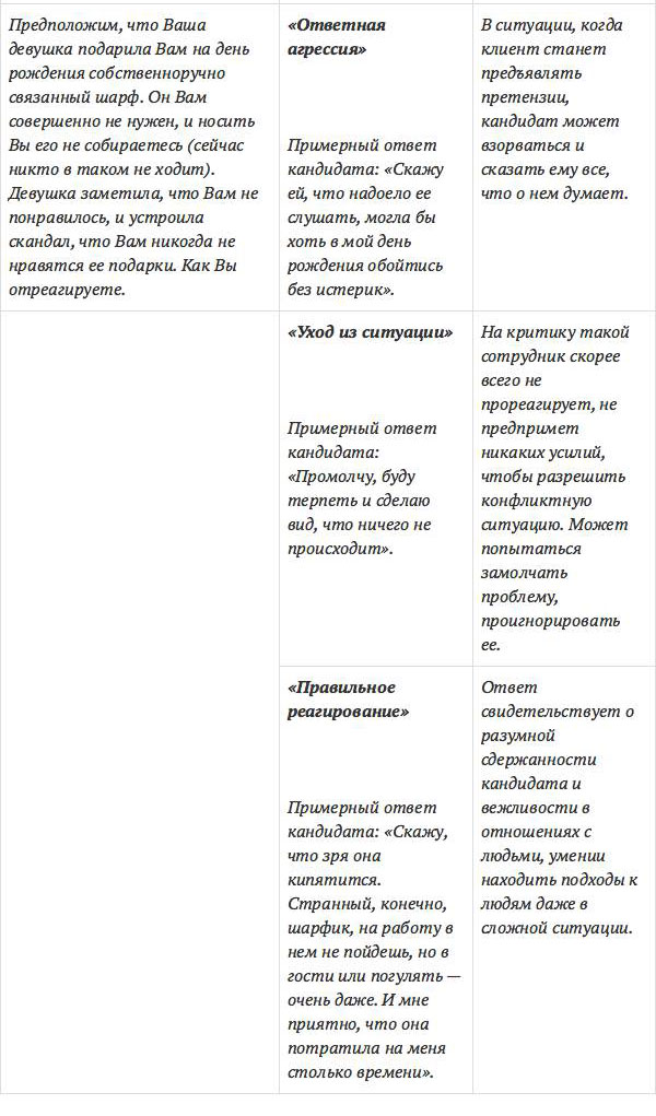 Вместе с тем, в процессе собеседования используются и профессиональные вопросы – критические ситуации. Например, если на вопрос: «Как Вы будете общаться (обычно общаетесь) с клиентом, который предъявляет Вам претензии?» кандидат отвечает, что «Выслушаю, постараюсь помочь, проявлю максимум стараний, чтобы соблюсти интересы компании и интересы клиента и т. д.», то можно говорить о правильной позитивной реакции; если ответ претендента будет звучать следующим образом: «Я с ним быстро разберусь: объясню ему, что он сделал не так при заказе» или «Скажу ему что-нибудь в ответ такое, чтобы больше не смел хамить», то это является сигналом низкой клиентоориентированности кандидата, неуважения к клиенту. Ответ: «Передам все претензии старшему продавцу или руководству. Пусть они разбираются. Это не мои обязанности» свидетельствует о пассивном и безответственном отношении к работе, так как сотрудник воспринимает себя как приемщика заказов – не более.