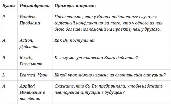 При проведении собеседования по компетенциям может быть применена технология проведения интервью PARLA, которая была разработана американской компанией Citizens Democracy Corp. и адаптирована специалистами Avanta Personnel к российской действительности. При использовании технологии PARLA вопросы менеджера по персоналу строятся по следующей модели: P – Problem (проблема); A – Action (действие); R – Result (результат); L–Learned (урок); A – Applied (изменение в поведении).