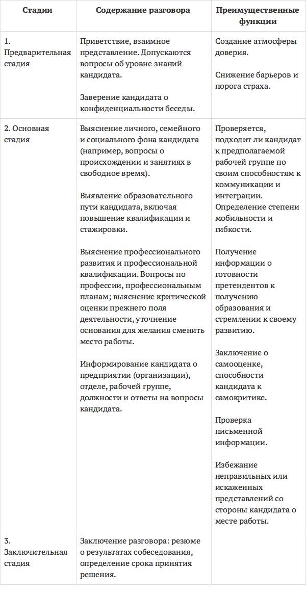 Можно выделить три основные стадии проведения собеседования: предварительная, основная, заключительная (см. табл. 1).