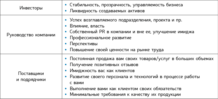Что им от нас нужно? Понятно, что деньги нужны всем. Но не только. Чем лучше вы понимаете потребности каждой стороны, тем больше у вас неденежных рычагов влияния на них. А значит, вы можете платить им меньше, увеличивая свою прибыль. Например, сотрудникам важна не только зарплата. Более того, лояльности к компании за деньги не купишь. Клиентам тоже важны не только скидки – гораздо лучше понять их настоящие потребности и качественно удовлетворить их, пусть и за б?льшие деньги, чем у конкурентов.