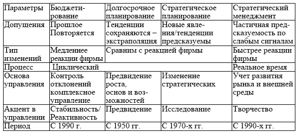 Сравнительный анализ генезиса систем стратегического управления, составленный по результатам исследований И.Ансоффа, приведен в табл. 1.