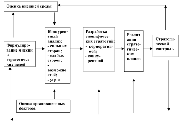 Согласно этой модели процесс стратегического планирования начинается с определения первоначальных целей развития предприятия. В соответствии с этими целями проводится анализ и оценка ресурсного потенциала предприятия и внешней среды. Целью такого рода анализа является выявление возможностей для принятия основных стратегических решений по дальнейшему проникновению на рынки сбыта и диверсификации производства.