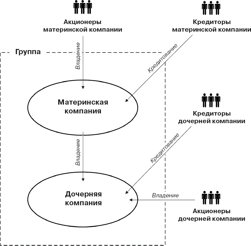 Материнская компания имеет возможность полностью контролировать бизнес дочерней компании. В совокупности материнская компания и все ее дочерние структуры образуют группу компаний (group), находящуюся под контролем материнской компании (рис. 1.2).