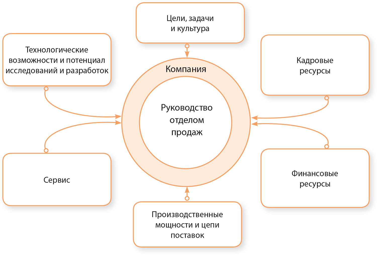 Принципы, ресурсы и кадры самой компании составляют важную часть внутренней среды. Руководители отделов продаж могут иметь определенное влияние на организационные факторы благодаря участию в процессах планирования на более высоких уровнях, но в краткосрочной перспективе планы продаж должны составляться в соответствии с обстоятельствами и ограничениями организационного характера. Параметры внутренней (организационной) среды можно объединить в шесть общих категорий: