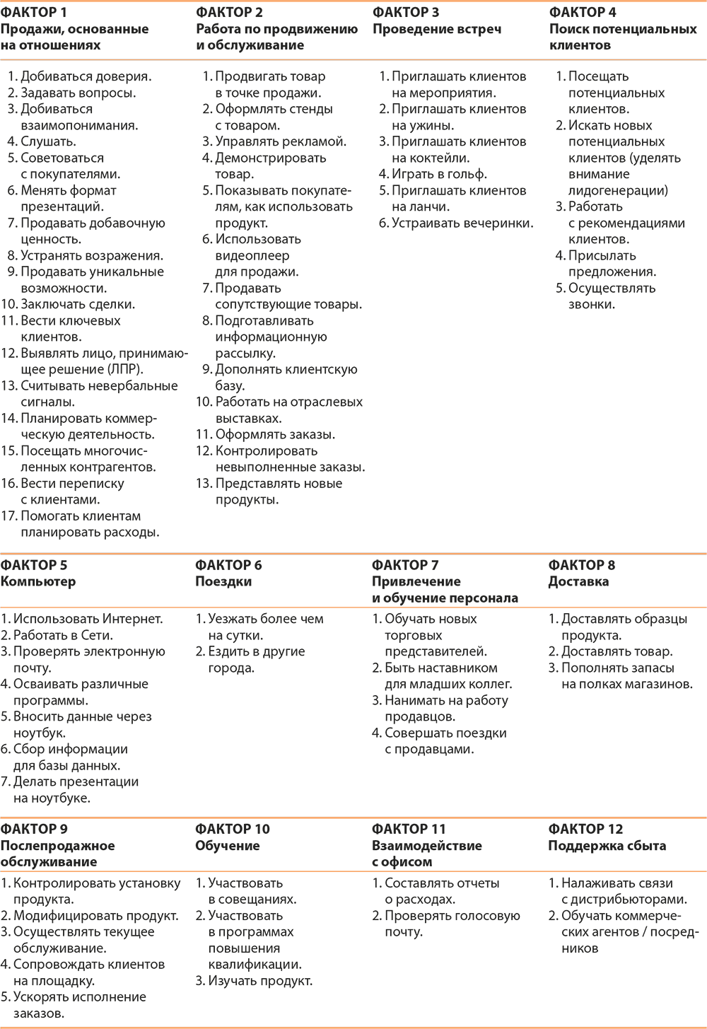 С учетом того, что мы уже знаем о сфере продаж и о факторах успеха, которые руководители отделов сбыта считают важными, никого не должно удивлять, что продавцы тратят значительную часть своего времени не только на коммерческие визиты, но и на сбор информации о потенциальных покупателях, планирование и координацию деятельности других подразделений организации и обслуживание существующих клиентов. Трудно составить полный перечень действий, которые выполняет продавец или торговый представитель, потому что они могут различаться от компании к компании и зависят от специфики решаемых задач. Как бы то ни было, в одном обстоятельном исследовании было выделено 12 функциональных факторов{14}. Они представлены в таблице 2.3 вместе с примерами конкретных видов деятельности, которые связаны с каждым из этих факторов.