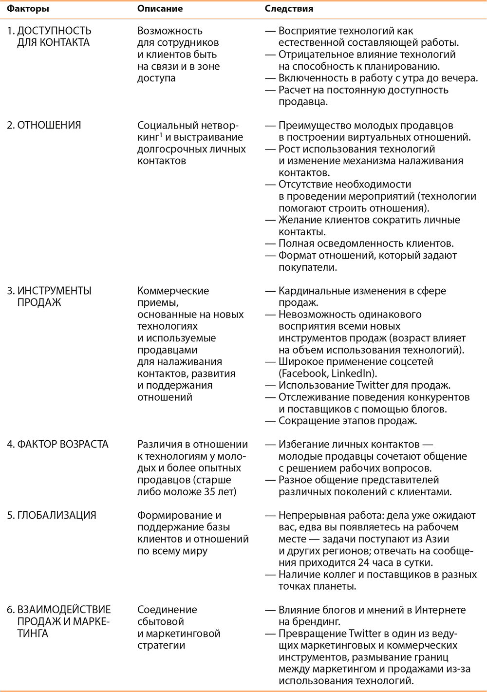 Один из очевидных выводов состоит в том, что работа продавца часто совмещается со многим другими видами деятельности, помимо собственно продаж, основанных на отношениях. Она предполагает выполнение множества функций. В таблице 2.4 представлены основные выводы другого исследования, в котором основное внимание уделялось факторам, связанным с технологиями и влияющими на деятельность отдела продаж. Обратите особое внимание на колонку Следствия: не всегда влияние новых технологий на деятельность торгового специалиста непременно положительно!