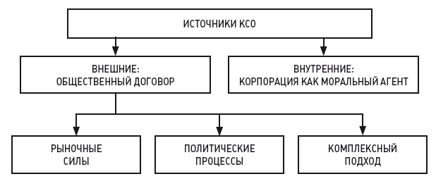 Таким образом, источниками КСО конкретной компании выступают общественные договоры как «макро-», так и «микроуровней», причем эта ответственность не может быть сформулирована без соответствующих исследований дескриптивного характера. Кроме того, сама логика ИТОД, как это ни парадоксально, подводит к необходимости учета и внешних (общественный договор), и внутренних (корпорация как моральный агент) источников КСО, поскольку сама корпорация как локальное экономическое сообщество может генерировать специфические моральные нормы.