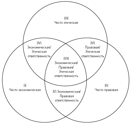 Вторая проблема изначально признавалась самим автором, и интересная попытка ее разрешения была предпринята в статье «Корпоративная социальная ответственность: трехсферный подход», написанной совместно с М. Шварцем [Schwartz, Carroll, 2003]. В качестве выхода была предложена замена пирамиды на диаграмму Венна, способную уловить нюансы взаимодействия экономической, правовой и этической ответственности (рис. 4).
