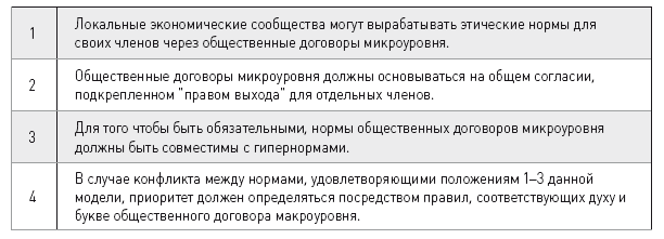 ИТОД основывается на предпосылке, что существующие нормативные подходы не в состоянии учесть реального многообразия бизнес-среды, особенно в глобальном контексте. Соответственно, управленческая этика характеризуется «ограниченной моральной рациональностью».[27] Для преодоления этой ограниченности, по мнению авторов, необходимо принимать во внимание два типа общественных договоров: «Первый из них – нормативный и гипотетический договор между экономическими агентами, подобный общественному договору в классических теориях философии и политической экономии. Этот всеобщий договор, в свою очередь, закладывает нормативные основы для выработки договора второго типа. Второй – реально существующий имплицитный договор, который возникает между членами локальных сообществ, включая фирмы, их подразделения, неформальные группы в этих подразделениях, национальные и международные экономические организации, профессиональные ассоциации и др.» [Donaldson, Dunfee, 1994, p. 254]. Соответственно, с одной стороны, ИТОД подчеркивает нормативную важность универсальных «гипернорм», таких как соблюдение прав человека и уважение человеческого достоинства, являющихся этическими принципами, фундаментальными для существования человеческого общества. С другой стороны, допускается сосуществование этих универсальных принципов со специфическими нормами, утверждаемыми и принимаемыми локальными сообществами. Несмотря на то что нормы локальных сообществ могут различаться и конфликтовать друг с другом, в рамках каждого сообщества они могут рассматриваться как легитимные, если свободно принимаются членами групп в качестве своего рода «договоров микроуровня» и не противоречат существующим «гипернормам». В итоге авторы выводят и предлагают для использования модель общественного «договора макроуровня» (табл. 2).