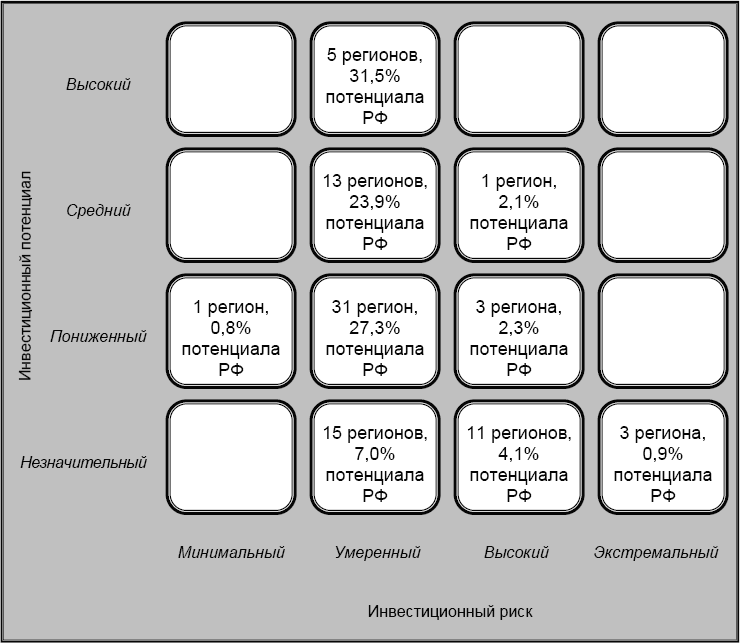 В группу российских регионов с самым высоким инвестиционным потенциалом вошли Москва, Московская область, Санкт-Петербург, Свердловская область и Краснодарский край. Треть инвестиционного потенциала страны приходится на Центральный экономический район, куда в период с 1999 по 2009 г. была направлена почти половина прямых иностранных инвестиций.[33] Рис. 2.2 иллюстрирует распределение 83 российских регионов по уровню инвестиционного потенциала и инвестиционных рисков в 2008–2009 гг.