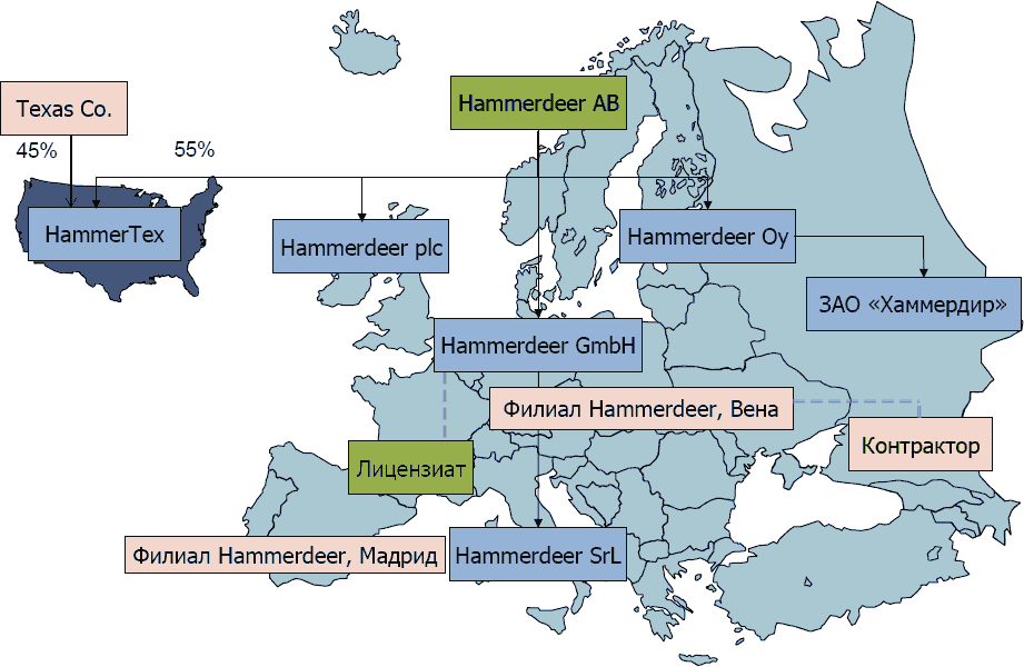 Кроме того, германское дочернее предприятие в свою очередь владеет дочерним предприятием в Италии, а финское подразделение – дочерним предприятием в России. Германское и итальянское дочерние предприятия имеют филиалы (не юридические лица), соответственно, в Австрии и Испании. В сферу влияния (контроля) корпорации входят также несколько независимых компаний за рубежом. Так, германское дочернее предприятие заключило с независимой французской компанией (компанией-партнером) лицензионное соглашение, в соответствии с которым французская компания осуществляет производство и сбыт продукции Hammerdeer во Франции. Австрийский филиал от имени германского дочернего предприятия заключил контракт на производство некоторых видов продукции корпорации с российским контрактором (реализация продукции на российском и смежных рынках осуществляется при этом австрийским филиалом).