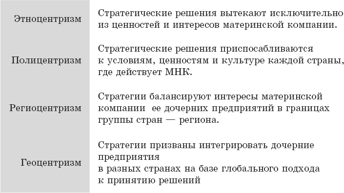 Большое значение для лучшего понимания феномена МНК имеет рассмотрение ценностей и интересов материнской компании. Х. Перлмуттер предложил в качестве концептуального подхода к описанию особенностей ведения деловых операций в другой стране так называемый EPRG-подход, в рамках которого различаются четыре возможных управленческих взгляда на международное окружение компании [Perlmutter, 1969, p. 9–18]. Менеджеры, исповедующие этноцентрический (ethnocentric) подход, исходят из идеи превосходства накопленного в своей стране опыта и из приоритета ценностей и интересов материнской компании.