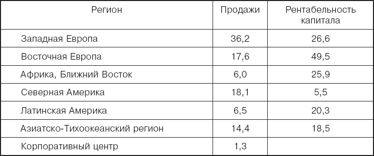 Объем продаж и рентабельность капитала по регионам, %, 2010 г.