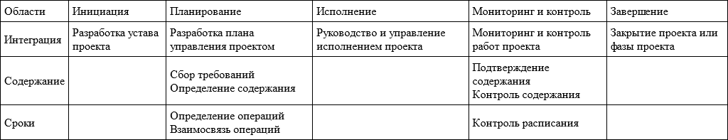 Таким образом, по международному стандарту РМВОК СУП (система УП) включает в себя: 42 процесса, 9 областей знаний, 5 групп процессов (см. табл. 1.3):