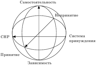 В качестве основополагающей образующей личности учителя В. И. Вачков выделяет творческое начало, которое тесно взаимосвязано с таким личностным качеством, как самостоятельность. Поэтому, рассматривая возможные степени выраженности творчества в личности, он представляет эту образующую личности педагога в виде шкалы, полюса которой обозначены как «самостоятельность» и «зависимость». В рамках системы диалогичных, «субъект-субъектных» отношений между учителем и учеником, основанной на принятии ими друг друга как ценностей, В. И. Вачков выделяет вторую координату, образованную континуумом «принятие» – «непринятие». Кроме того, в процессе педагогической деятельности основные способы ее реализации определяются континуумом «система принуждения (СП)» – «система, направленная на развитие (СНР)» [72].