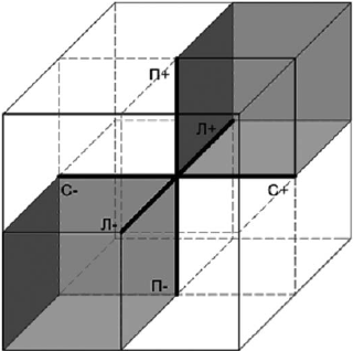 С+ и С—, Л+ и Л—, П+ и П— выраженность социально, личностно и профессионально ориентированных векторов; серый цвет обозначает крайние варианты выраженности характеристик (С – Л – П— и С+Л+П+)
