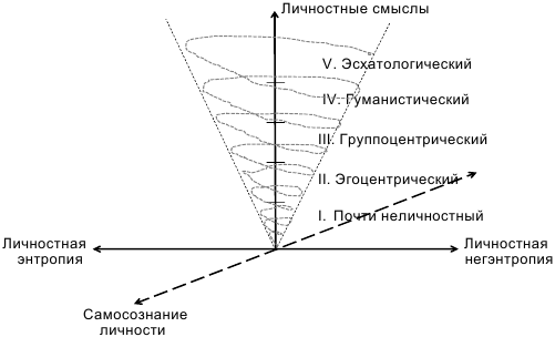 Развитие в данном пространстве идет по спирали в направлении оси координат «личностные смыслы» (рис. 5), причем все уровни смыслового вектора выступают законченным циклом спирали развития. Весь полный цикл развития личности, куда входят рассмотренные смысловые уровни, содержит одиннадцать кризисных фаз, в которых субъект выступает источником энтропии, и десять стабильных, где субъект демонстрирует антиэнтропийные возможности. Внутренний план «кризиса» связан с отказом от старых смысловых оснований, чтобы создать новые и трансформировать степень принятия ранее сложившихся смысловых уровней. Внешний предполагает временное разрушительное воздействие субъекта на ближнее и дальнее окружение.