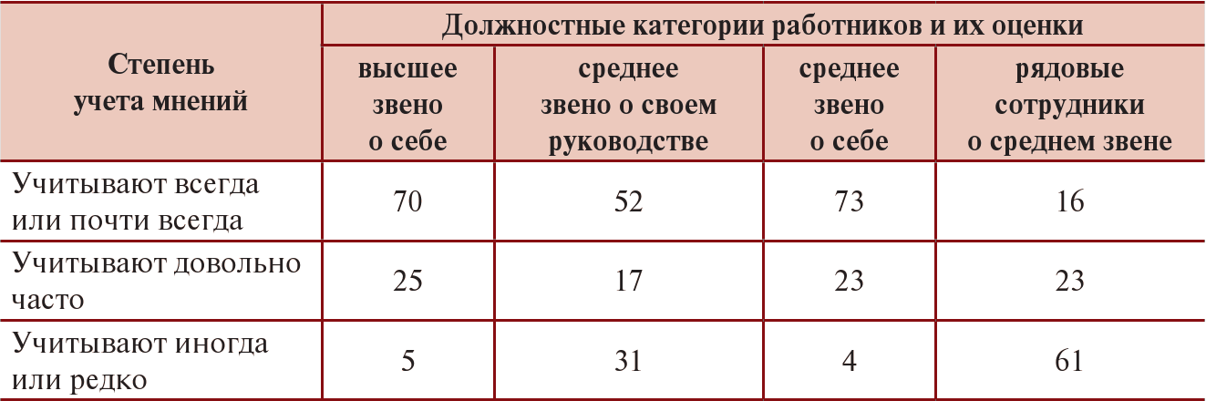 Обработка результатов опроса выявила заметные расхождения во взаимных оценках, сделанных представителями разных должностных категорий. Так, 70 % руководителей высшего звена считали, что при принятии решений они всегда или почти всегда учитывают мнение подчиненных. В то же время среди их подчиненных такого же мнения придерживались лишь 52 %. Еще больший разрыв (73 и 16 %) обнаружился между оценками руководителей среднего звена и рядовых сотрудников (табл. 3.1).