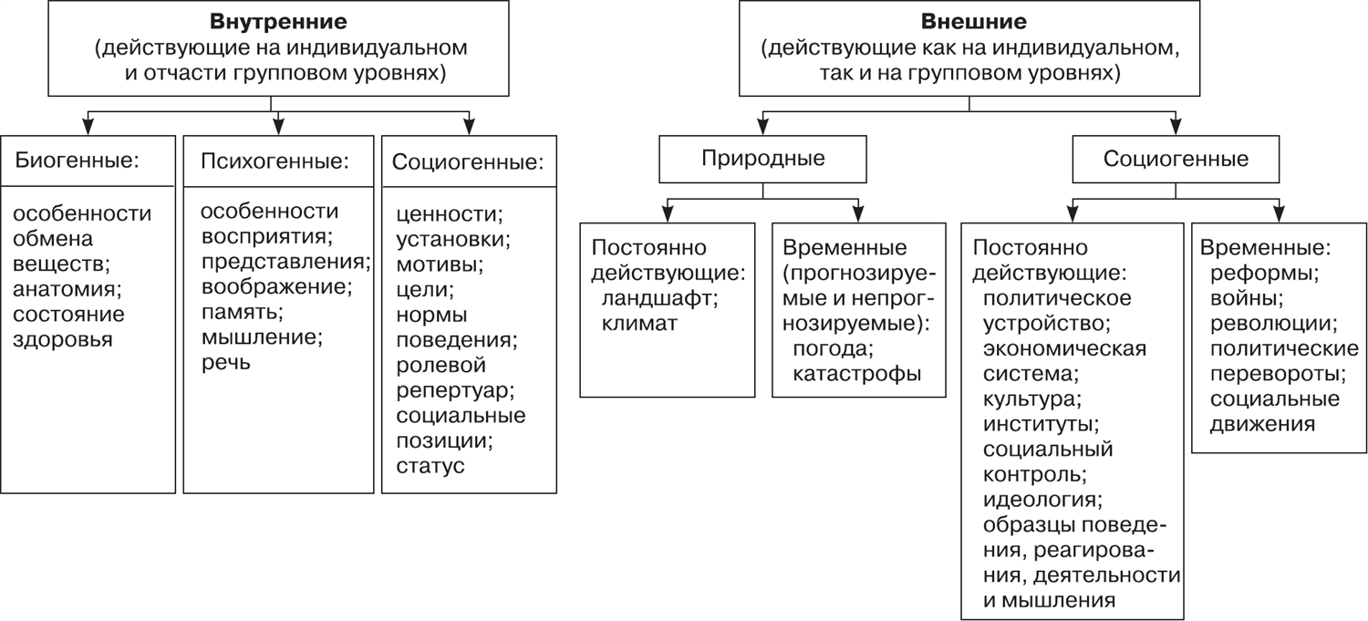 Не вдаваясь в детали этой достаточно серьезной научной дискуссии, напрямую выходящей на идеологию и, следовательно, политику, согласимся пока с тем, что реальное поведение людей является в конечном счете итогом очень сложного и все еще недостаточно изученного взаимодействия многих факторов. Факторы реального поведения людей и групп могут иметь различное происхождение: как внешнее, так и внутреннее, как естественное (природное), так и искусственное (социальное), как случайное, так и закономерное, постоянно повторяющееся в определенных обстоятельствах (рис. 4.1).