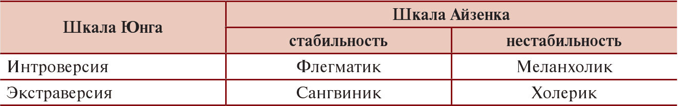 Как можно видеть из таблицы, сочетание свойств интроверсии и стабильности соответствует флегматическому темпераменту, сочетание свойств интроверсии и нестабильности – меланхолическому, нестабильности и экстраверсии – холерическому, а экстраверсии и стабильности – сангвиническому темпераменту.
