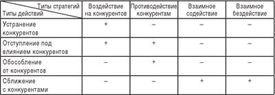 Существует взаимосвязь типов конкурентного взаимодействия участников рынка и типов их стратегий. Первый из названных типов стратегий конкурентных действий основан на преобладании воздействия на конкурентов, второй – на сочетании воздействия и противодействия, третий – на преобладании противодействия конкурентам, четвертый – на сочетании воздействия на конкурентов и противодействия им с их взаимным содействием или рациональным взаимным бездействием (табл. 3.1).