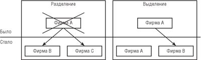 Она применяется в процессе создания новых субъектов предпринимательства в результате реорганизации крупных фирм или их ликвидации. В первом случае дезинтеграция бизнеса имеет явный характер, во втором случае – скрытый. В обоих случаях новые участники рынка выводятся из интеграционных внутрифирменных процессов (рис. 3.26).