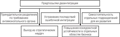 Конкретные предпосылки применения стратегии дезинтеграции могут быть разными. Субъекты среднего или малого предпринимательства прибегают к ней для преодоления избыточной консолидации бизнеса, «захлебываясь» масштабами бизнеса, с которыми не могут совладать. Крупные участники рынка, в том числе те, которые ранее занимали доминирующее положение, либо продолжают занимать такое положение, либо изначально создавались для обеспечения доминирования на тех или иных секторах рынка, руководствуются рядом соображений (рис. 3.28):