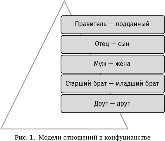Конфуций предлагал пять моделей отношений: правитель – подданный, отец – сын, муж – жена, старший брат – младший брат и друг – друг (рис. 1). Из-за иерархичности китайского общества важную роль играют титулы. Китайцы, а также японцы и корейцы обращаются к друг другу по соответствующей форме: «мистер Вон», «президент Ли», «генерал Хуан».