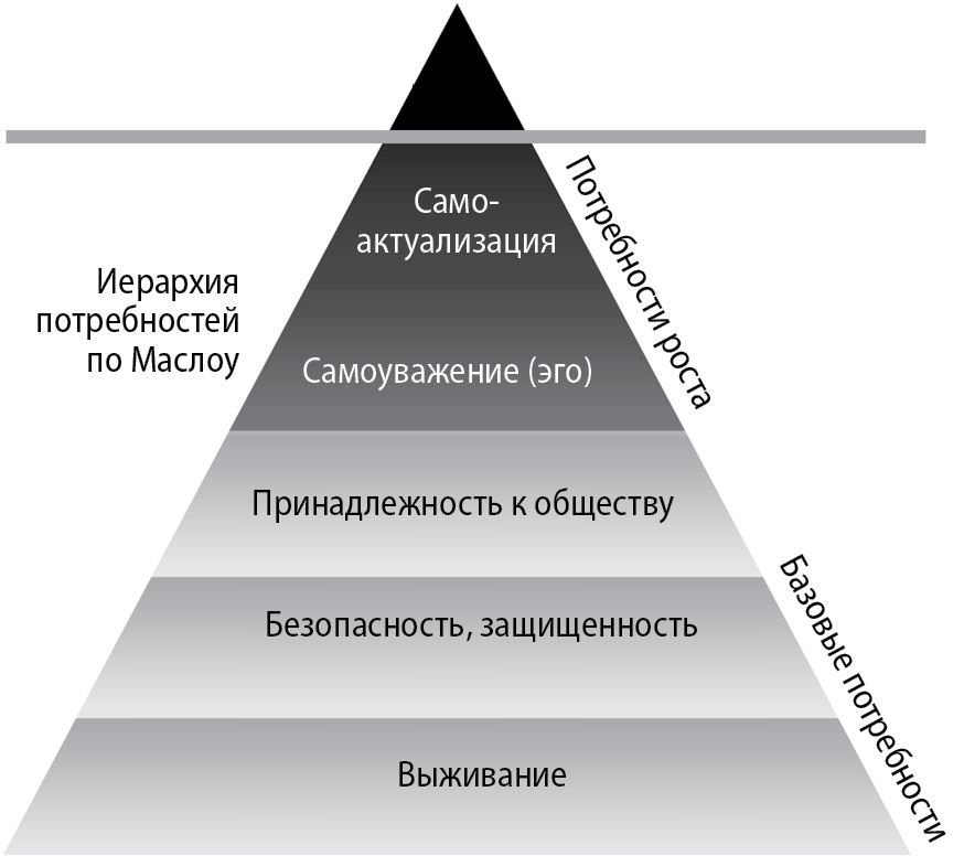 Консультанты и тренинг-менеджеры, которые занимаются развитием индивидуальных и личностных качеств, хорошо знакомы со знаменитой «пирамидой потребностей» Маслоу и используют ее в работе как схему человеческой психики. Это одна из наиболее распространенных моделей ранжирования личностных приоритетов, в которой все побуждения индивида сведены в одну таблицу; и она приводится практически во всех учебных пособиях и буклетах курсов по управлению преобразованиями.