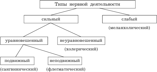 Одна из классификаций связывает особенности темперамента с различием типов высшей нервной деятельности. По учению физиолога И. П. Павлова, типы высшей нервной деятельности характеризуются такими основными свойствами, как сила, уравновешенность и подвижность процессов возбуждения и торможения (см. рис. 2). Под силой понимается работоспособность нервных клеток, их способность выносить сильное напряжение, не впадая в заторможенное состояние.