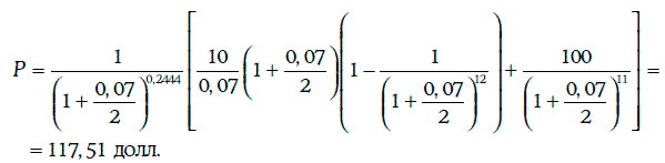 Пример 1.14. Дана 10 %-ная облигация с полугодовыми купонами номиналом 100 долл., погашаемая 1 марта 2003 г. Определим, какова была цена этой облигации 17 июля 1997 г. при требуемой доходности в 7 %.