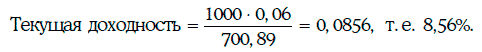 Пример 1.17. Определим текущую доходность 6 %-ной облигации с полугодовыми купонами номиналом 1000 долл., продающейся по цене 700,89 долл., когда до ее погашения остается 18 лет.