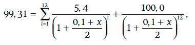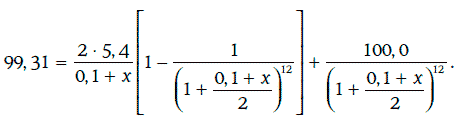 Пример 1.20. Дана 6-летняя облигация с плавающей купонной ставкой номиналом 100 долл. Купонная ставка больше ставки-ориентира на 80 базисных пунктов и определяется каждые 6 месяцев. Определим маржу дисконтирования, если цена облигации 99,31 долл., а текущее значение ставки-ориентира – 10 %.