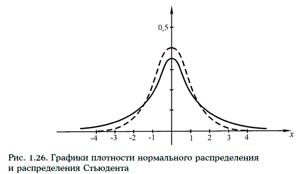 2. При возрастании числа степеней свободы распределение Стьюдента стремится к стандартному нормальному распределению. При этом распределение Стьюдента имеет более тяжелые ветви, чем стандартное нормальное распределение. На рис. 1.26 изображены графики плотности стандартного нормального распределения и распределения Стьюдента с тремя степенями свободы.