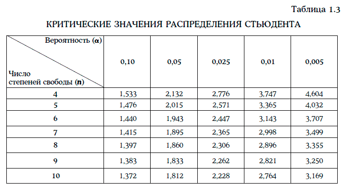 Критические значения распределения Стьюдента указаны в табл. 1.3.