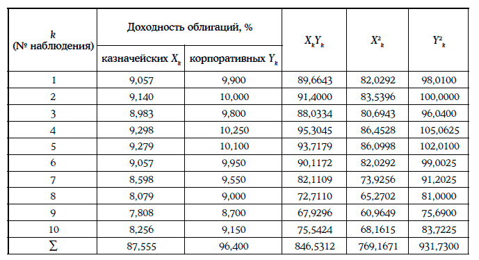 Пример 1.63. Построение линейной регрессионной зависимости доходности среднесрочных корпоративных облигаций одного и того же кредитного рейтинга (?) от доходности 10-летних казначейских облигаций (?). Исходная информация и предварительные расчеты приведены в таблице ниже.