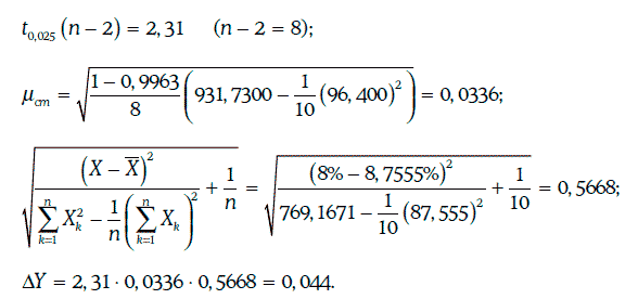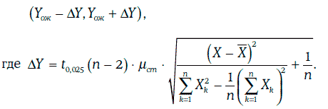 При отсутствии автокорреляции[17] и гетероскедастичности[18] доверительный интервал для значения случайной величины ? при заданном уровне надежности может быть найден в виде: