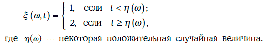 Сечением случайного процесса ?(w, t) в момент времени t является случайная величина, принимающая значение 1 с вероятностью, равной P{?(w) > t}, и значение 2 с вероятностью, равной P{?(w) ? t}.