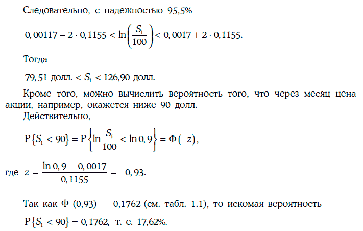 Пример 1.72. Инвестор считает, что цена бездивидендной акции описывается геометрическим броуновским движением с коэффициентом смещения 0,1 и годовой волатильностью 40 %. В данный момент времени цена акции равна 100 долл. Инвестора интересует цена этой акции через месяц.