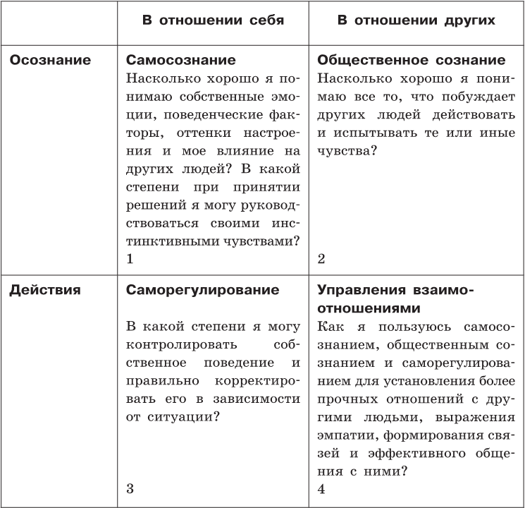 Эмоциональный интеллект не относится к тем свойствам, которые можно по желанию включать в действие и так же легко отключать. Скорее можно говорить о том, что он формируется и развивается таким образом, чтобы потом все время оставаться «включенным». Если у вас с кем-то складываются хорошие отношения, то, вполне вероятно, ваш EQ уже является высоким. Если же отношения не складываются, полезно проанализировать ваши отношения и виды поведения, использовав по очереди все квадранты, которые приведены на рисунке, и подумать, что вы можете делать по-другому, что положительно повлияло бы на ваши пока не складывающиеся отношения. Не ожидайте, что свое поведение по отношению к вам будут менять другие. Посмотрите, что вы сами можете делать иначе.