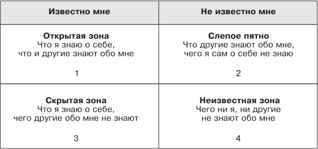 Окно Джохари является простым инструментом для понимания того, что мы знаем о других и что другие знают о нас. Независимо от того, осознаем мы это или нет, мы постоянно демонстрируем другим себя и те или иные свои качества. К тому же мы, возможно, обладаем скрытым потенциалом, который не очевиден ни нам самим, ни другим людям. Окно Джохари, названное так в честь его создателей, Джозефа Лафта (1916–2014) и Гарри Ингама (1914–1995), представляет собой коммуникационную модель, которая была разработана для укрепления доверия между людьми на основе информации, сообщаемой о себе, и получения обратной связи от других. В схематичном виде эта модель представляет собой матрицу, разделенную на четыре квадранта, содержащих определенную комбинацию того, что мы и другие знаем друг о друге (рис. 20.1).